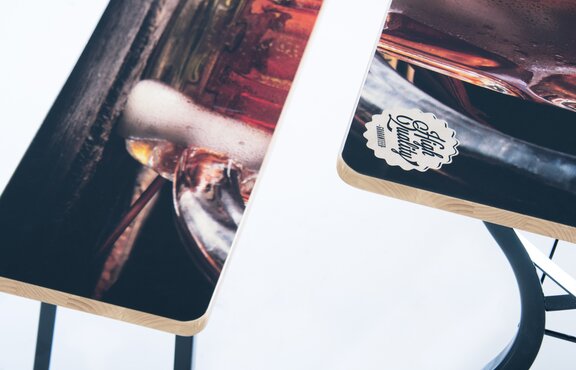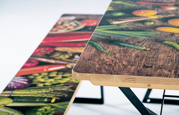 Durch diese Vorgangsweise werden die Festzeltgarnituren lichtbeständig, kratzfest und abwischbar. Da sich das Motiv zwischen zwei Lackschichten befindet, wird es optimal geschützt.