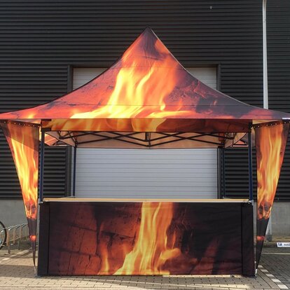 When you're looking to make a lasting impression for your brand or your client, customization is key. Start with high-quality canopy tent printing with the help of our in-house Graphic Design team. Select from our frame and fabric colors, signature roof styles like the Square or automatic awning tents, accessories like flags, and our range of sidewall options.