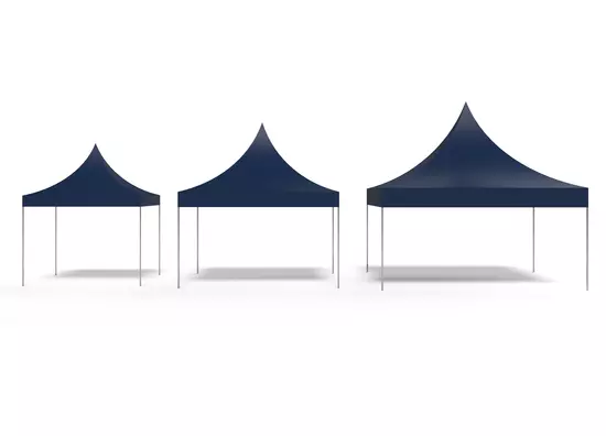 Three blue gazebos stand next to each other. They are 3x3 m, 4x4 m and 5x5 m in size.