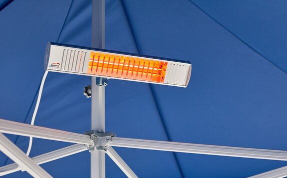 Le temperature si abbassano? Non c'è motivo di spostare il tuo evento all'interno o addirittura saltare un tour promozionale o un giorno di mercato. Con i nostri riscaldatori a infrarossi per gazebo, il tuo gazebo pieghevole sarà bello caldo e accogliente anche nelle giornate più fredde. I riscaldatori a infrarossi per gazebo (1.500 Watt, 250 V, 50 Hz) possono essere comodamente montati sul palo centrale o quello angolare e cominceranno a scaldare appena attaccati alla corrente!